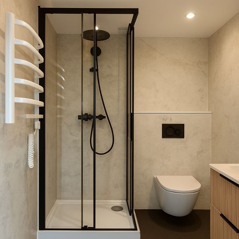 W środku znajdziesz błyszczącą ceramikę marki Roca, niezawodną armaturę Geberit i Omnires, oraz solidną antresolę z wygodną drabinką — idealną na dodatkową przestrzeń do spania lub wypoczynku. Całość dopełnia perfekcyjnie zaprojektowany aneks kuchenny, łączący funkcjonalność z nowoczesnym designem.