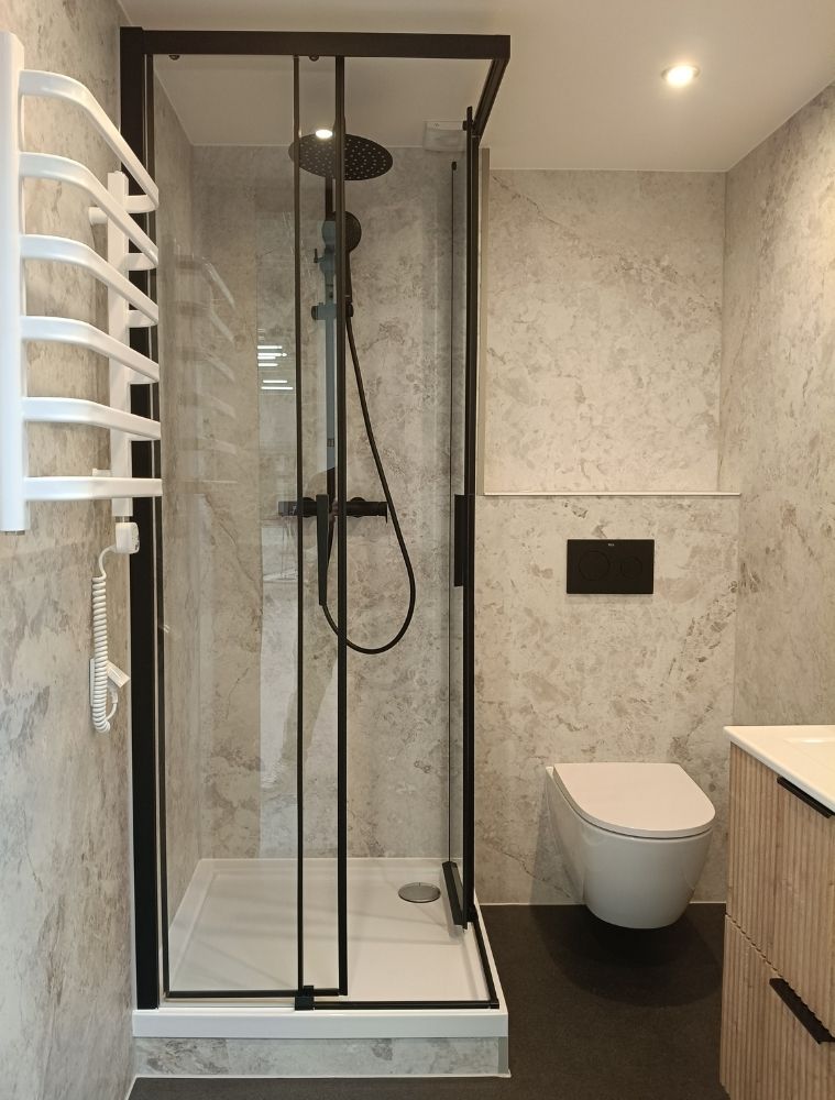 W środku znajdziesz błyszczącą ceramikę marki Roca, niezawodną armaturę Geberit i Omnires, oraz solidną antresolę z wygodną drabinką — idealną na dodatkową przestrzeń do spania lub wypoczynku. Całość dopełnia perfekcyjnie zaprojektowany aneks kuchenny, łączący funkcjonalność z nowoczesnym designem.